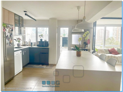 Hermoso y ampliodepartamento. Amplios y luminosos recibos con cocina integrada. Logia. 2 amplios dormitorios, Ppal.suite. 2 baños. Aire acondicionado. Todo piso porcelanato. Estacionamiento, bodega