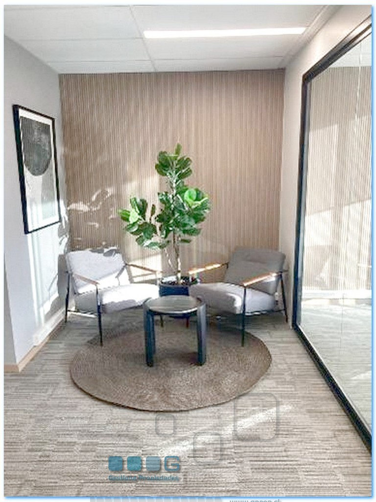 UF 36 más IVA. Amoblada. Full habilitada. Recepción amplia, 2 privados. 1 baño. Estacionamiento. Disponibilidad inmediata. Alfombra, luminarias, chapa digital, papel mural. etc.). Edificio clase A.