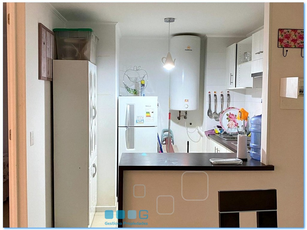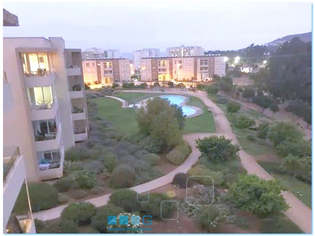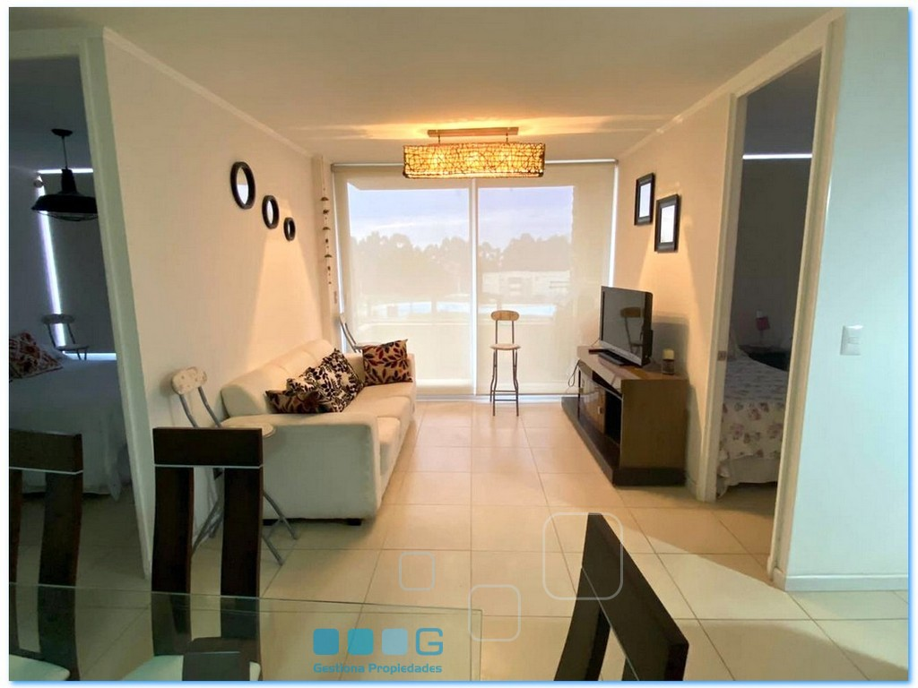 A pasos de la playa. Luminoso departamento. Recibos con Terraza. Cocina americana equipada. 2 dormitorios. 1 baño. Estacionamiento, bodega. 2 piscinas, lindo condominio con amplias áreas verdes