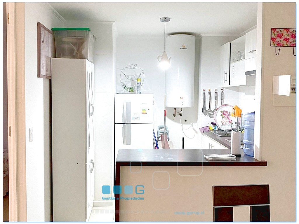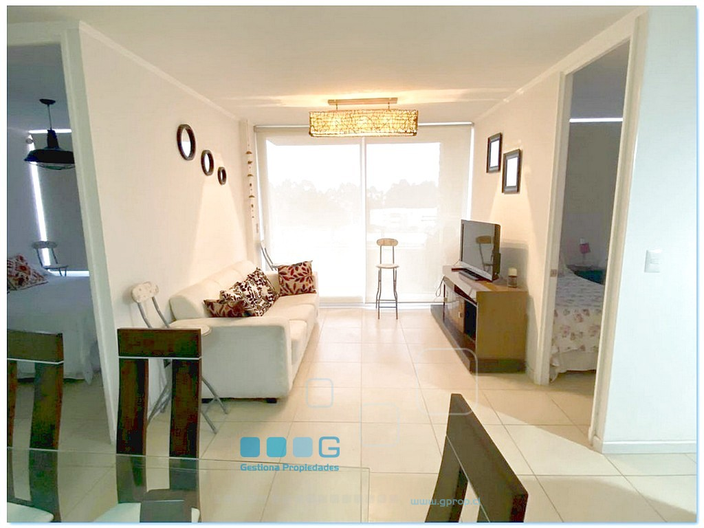 OPORTUNIDAD. A pasos de la playa. Luminoso departamento. Recibos con Terraza. Cocina americana equipada. 2 dormitorios. 1 baño. Estacionamiento, bodega. 2 piscinas, lindo condominio con amplias áreas verdes