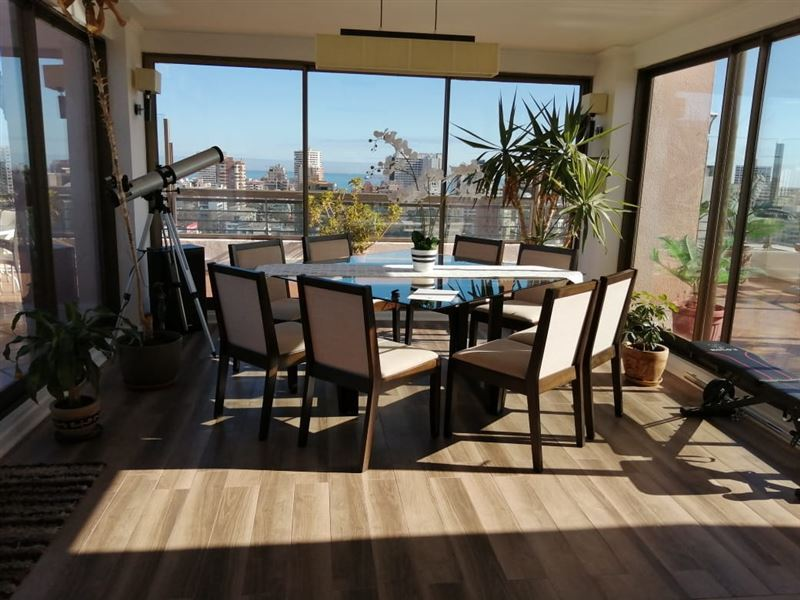 AMPLIO PENTHOUSE UBICADO EN BARRIO RESIDENCIAL Y TRADICIONAL DE VIÑA DEL MAR, DE UNA SUPERFICIE DE 200 M2, HALL DE ACCESO CON DISTRIBUCION A AMPLIO LIVING COMEDOR CON VENTANALES TERMOPANEL, SALIDA A TERRAZA , LA CUAL TIENE UNA VISTA AL PONIENTE, NOR-PONIENTE, SUR, CON SUPERFICIE DE 100 M2, VENTANALES CON VIDRIOS LAMINADOS, UN JACUZZI PARA 4 PERSONAS, 4 DORMITORIOS, 1 EN SUITE CON JACUZZI, 2 BAÑOS CON CUBIERTA DE MARMOL, COCINA TRADICIONAL, LOGGIA CON SALIDA A TERRAZA. CALEFACCION CENTRAL, 2 ESTACIONAMIENTOS 1 BODEGA.EDIFICIO CUENTA CON SEGURIDAD 24/7, PISCINA TEMPERADA, GIMNASIO.